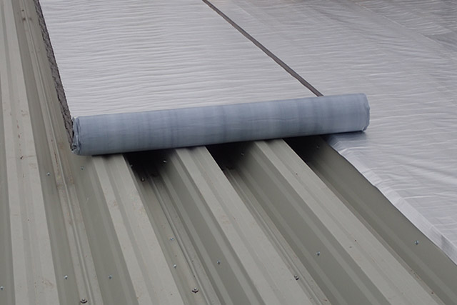 Flexible reinforced SBS-modified bitumen membrane VAPORSTOP CA 500 is used as a high-performance vapor barrier in roof waterproofing systems. Self-adhesive bottom surface and high tensile strength ensure the ability of the material to withstand the weight of the person standing between the corrugations of the profiled metal deck without breaking or stretching.