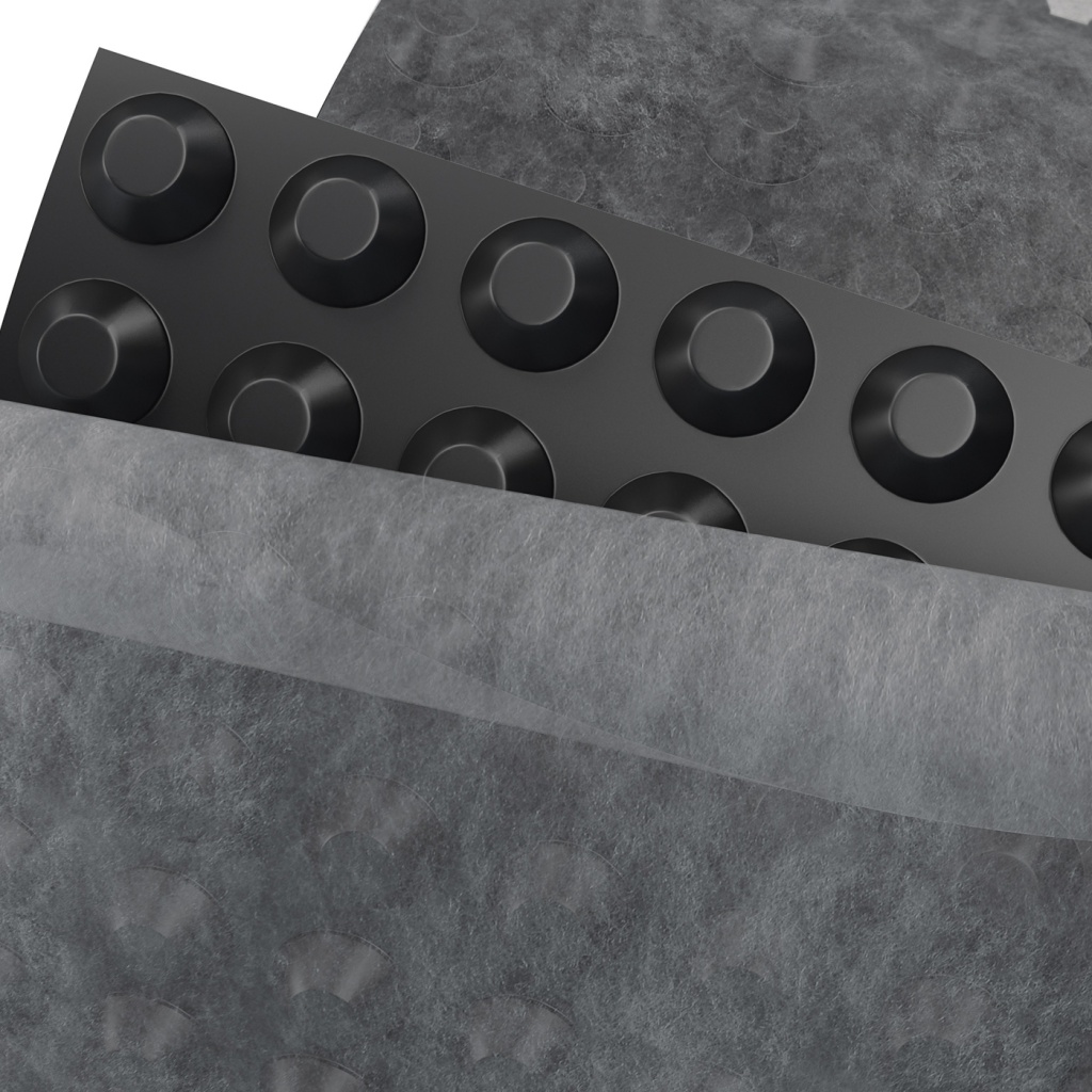 PLANTER geo is a double-layer dimpled membrane. The first layer of the material is produced by extrusion method on a base of high-density polyethylene (HDPE) covered with conic studs 8 mm in height and 10 mm in diameter. The second layer is a thermally bounded geotextile glued to the membrane.