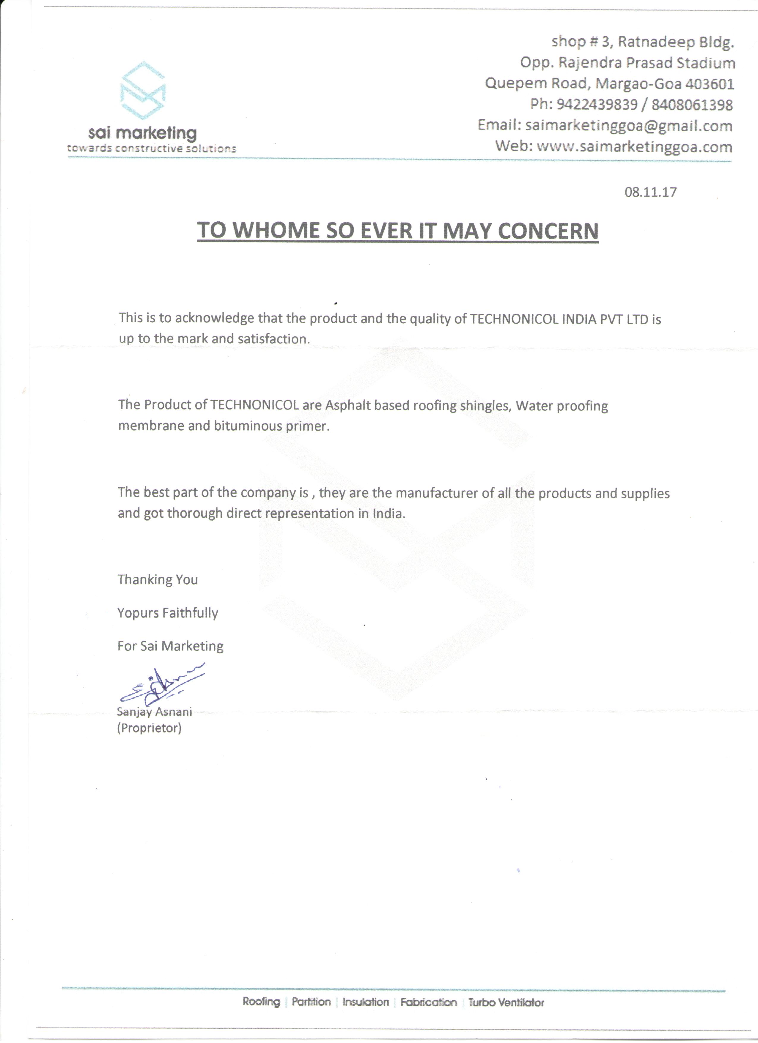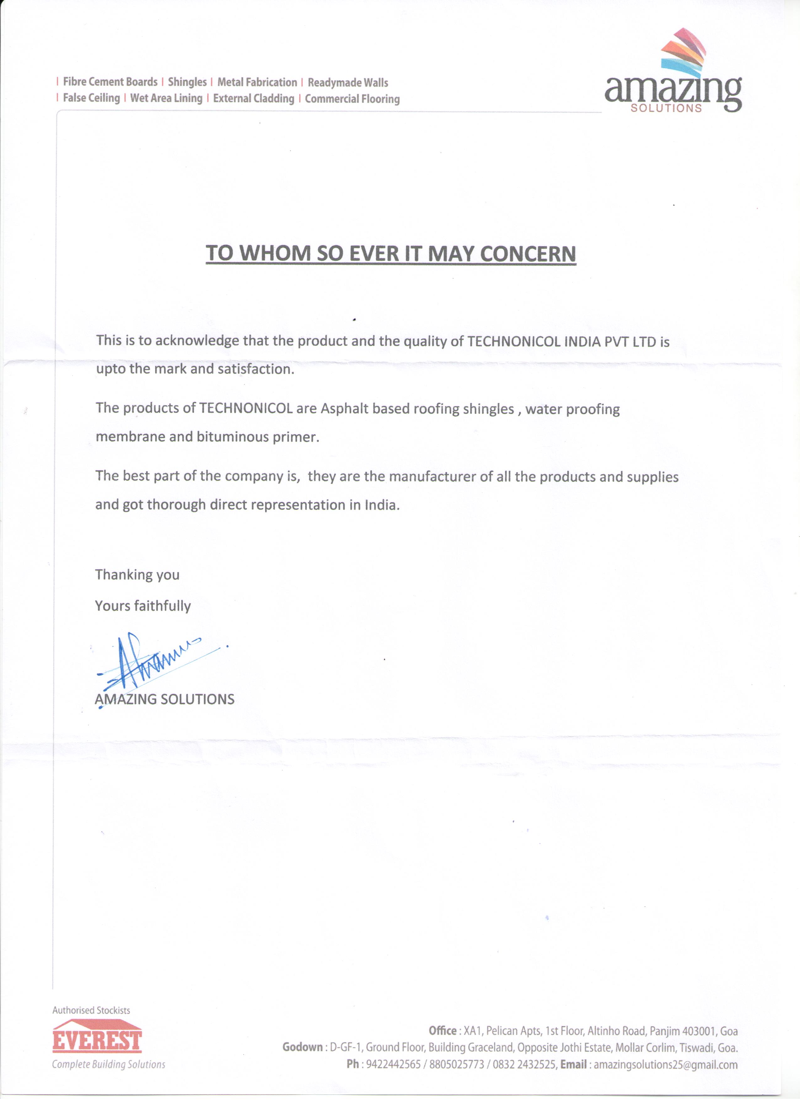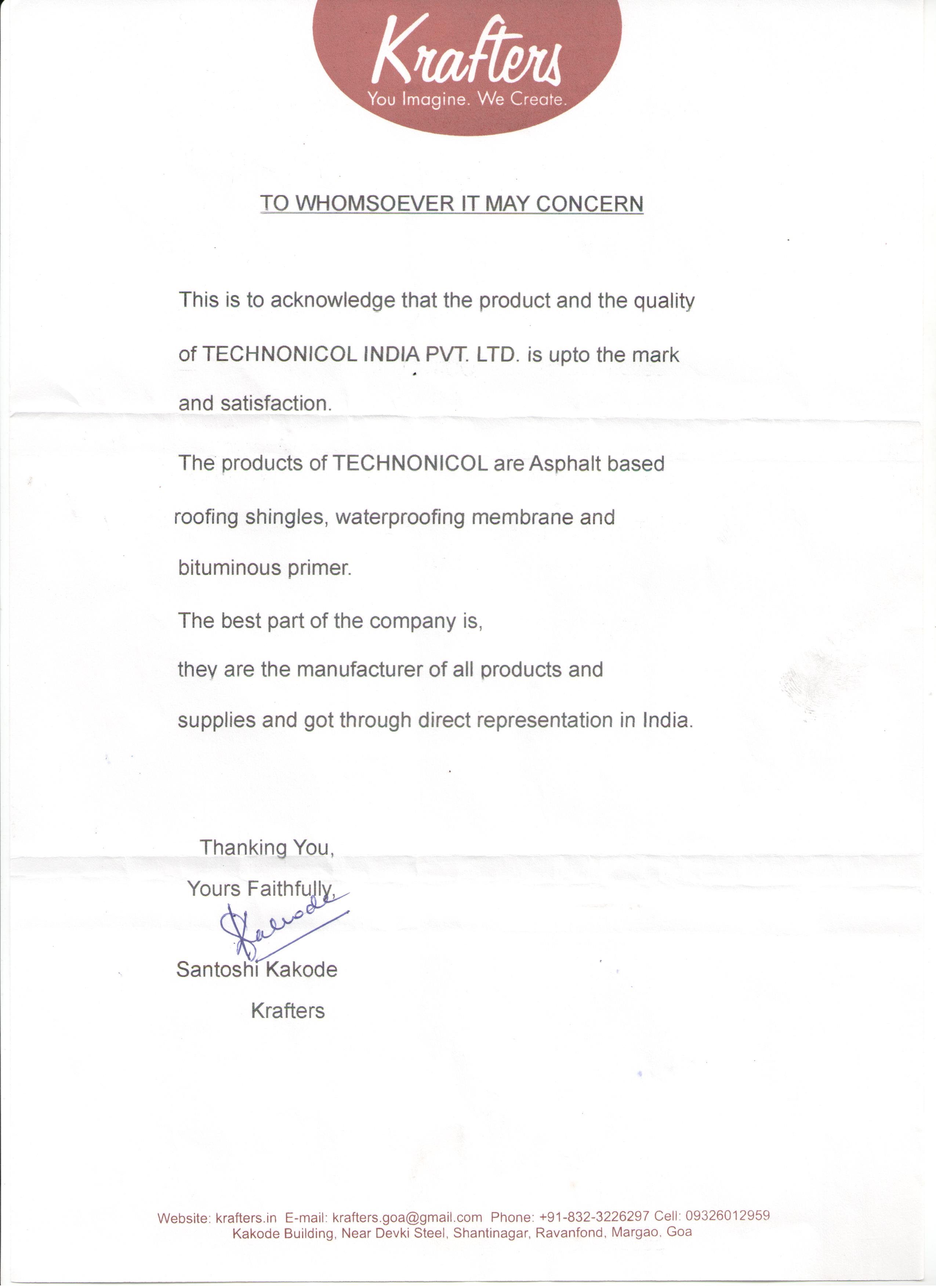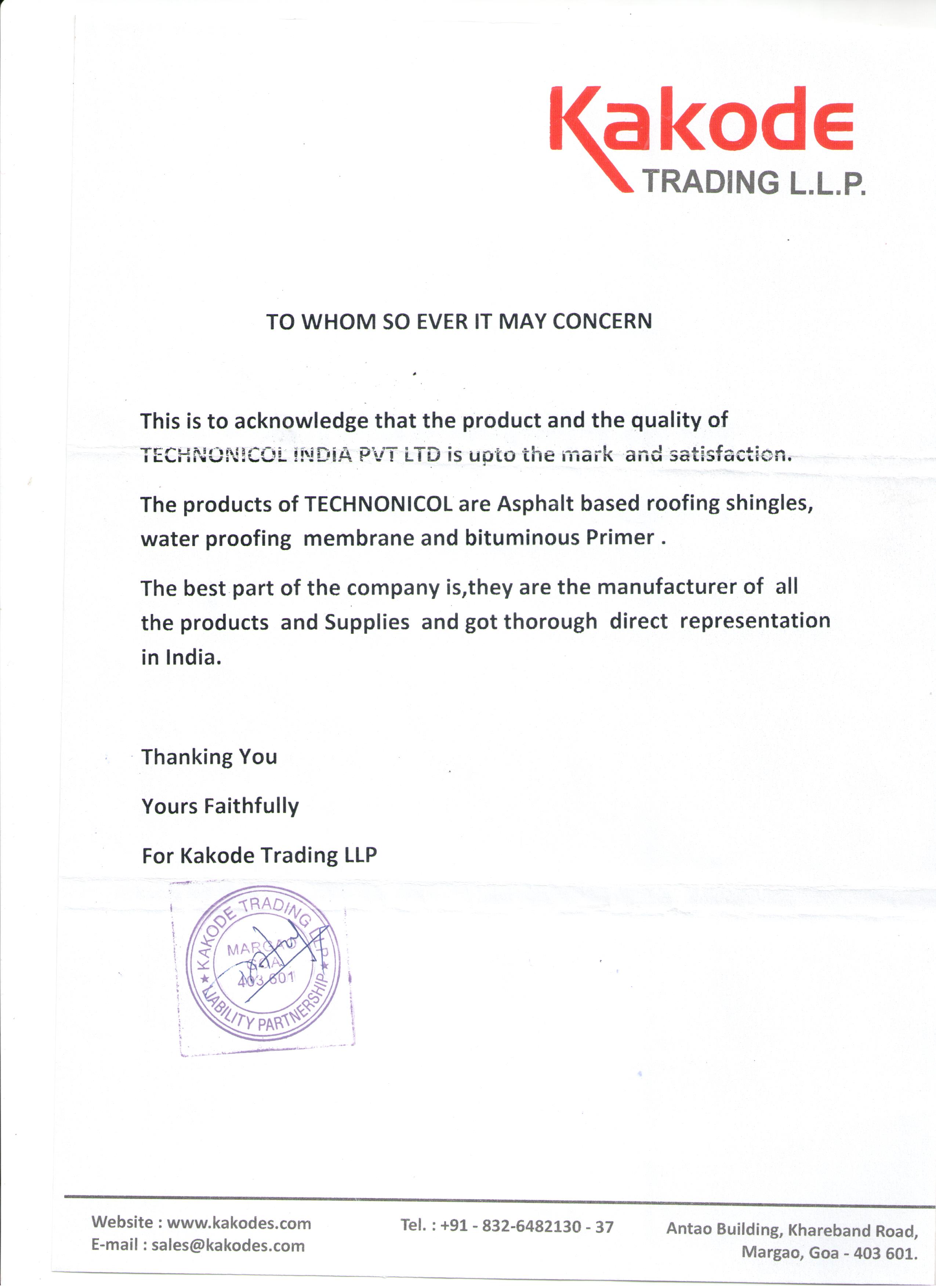This is to acknowledge that the product and the quality of TECHNONICOL INDIA PVT LTD is upto the mark and satisfaction. The products of TECHNONICOL are Asphalt based roofing shingles, water proofing membrane and bituminous primer. The best part of the company is, they are the manufacturer of all the products and supplies and got thorough direct representation in India.