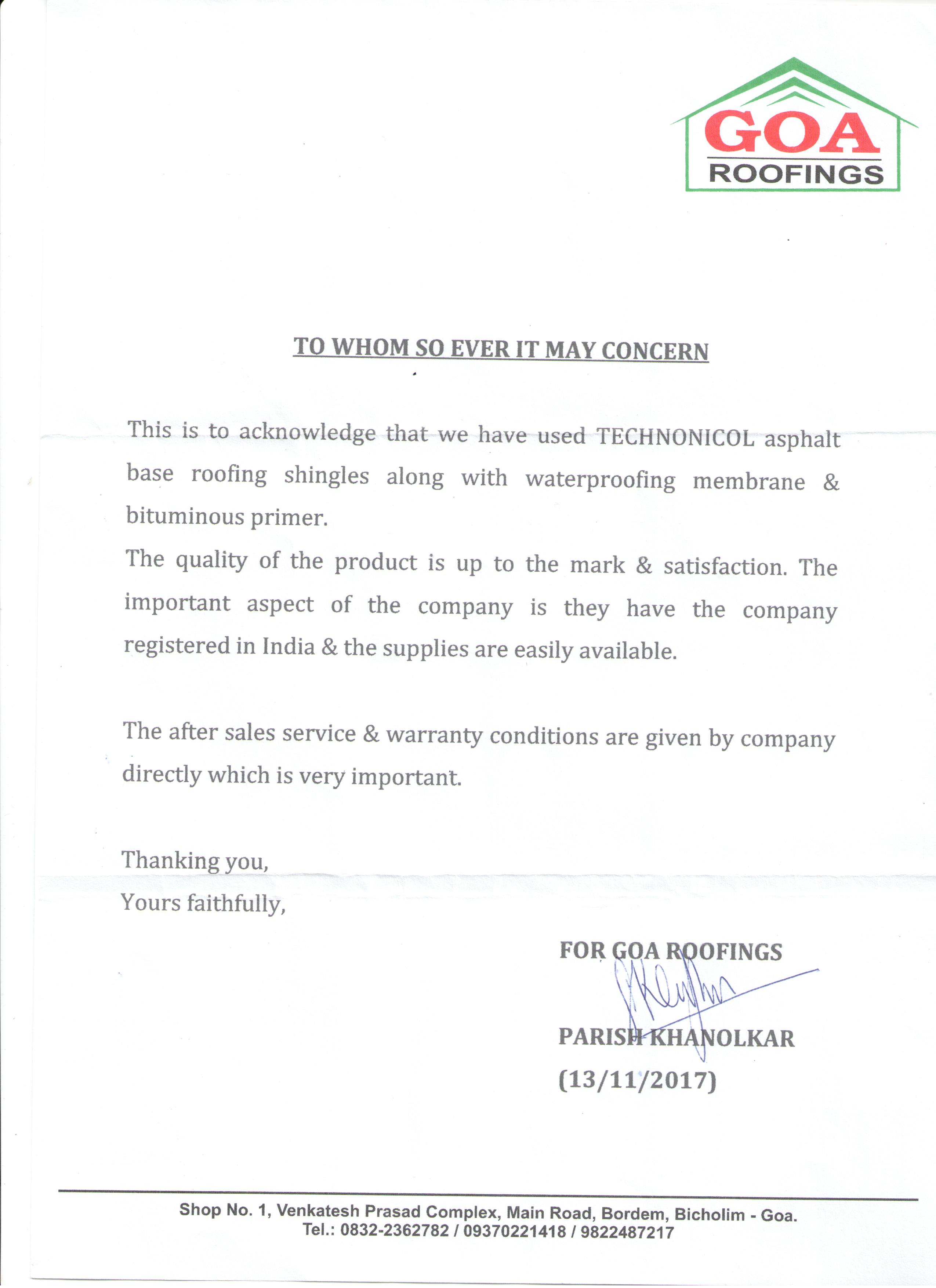 This is to acknowledge that we have used TECHNONICOL asphalt base roofing shingles along with waterproofing membrane & bituminous primer. The quality of the product is up to the mark & satisfaction. The important aspect of the company is they have the company registered in India & the supplies are easily available. The after sales service & warranty conditions are given by company directly which is very important.